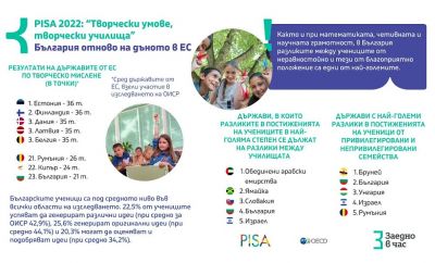 ОИСР представи резултатите от тази област на PISA на 18-ти юни и изводите за България отново не са добри. Подобно на излезлите през декември резултати по четивна, математическа и научна грамотност, страната ни пак е на последните места в ЕС и по творческо мислене. Българските 15-годишни ученици са постигнали среден резултат от 21 точки при средно за ОИСР 33. Така те попадат в групата на учениците от Тайланд и Йордания. Повече от половината от българските ученици не достигат базовото трето ниво на PISA по творческо мислене.