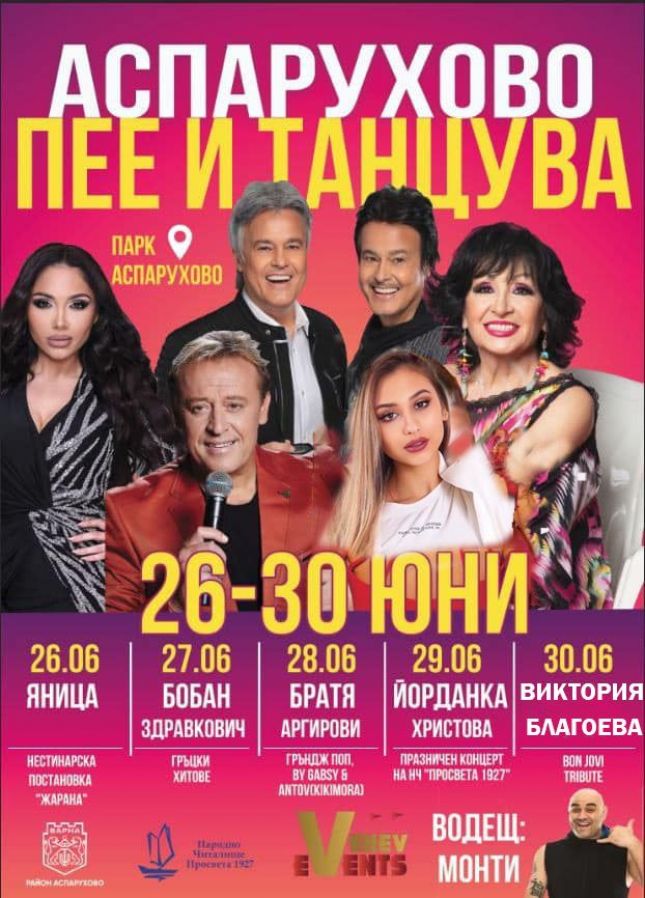 "Традицията повелява да стартираме лятото с много свежи изненади и чакани забавления! Заповядайте на Аспарухово пее и танцува" от 26 до 30 юни в парк "Аспарухово", за да се насладите на вкусна храна, студени напитки, цветни атракциони и страхотни развлечения за малки и големи!