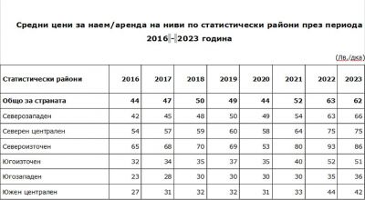 През 2023 година средната цена за наем/аренда на един декар ниви достига 62 лв., което е с 1.6% по - малко спрямо 2022 година.