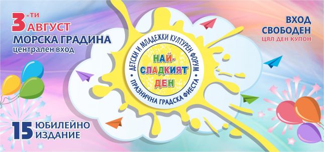 Юбилейното XV издание на „Най-сладкият ден“ ще се проведе на 3 август /събота/ от 10:00 до 20:00 часа, а мястото отново е централният вход на Морската градина - Варна. Входът е свободен.