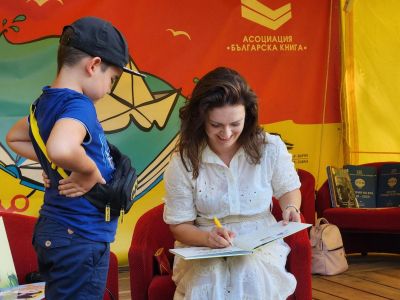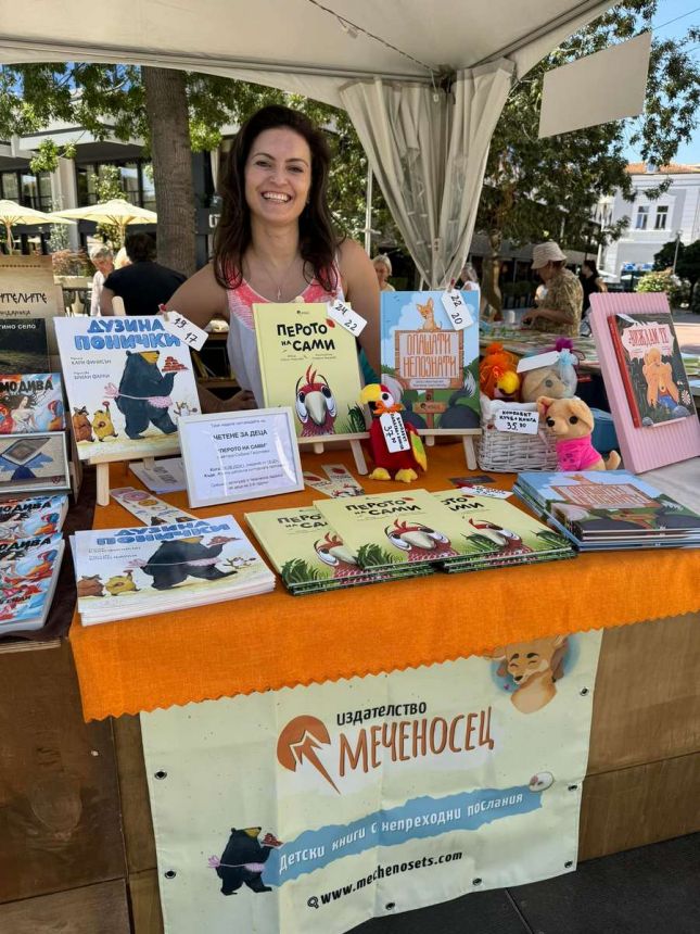 Авторът Събина Георгиева представи книгата си за деца "Перото на Сами" на сцената на културната програма в компанията на много малчугани и техните родители. Това е втора авторска творба за писателката и третото заглавие, излязло с логото на младото варненско издателство за детска литература "Меченосец".