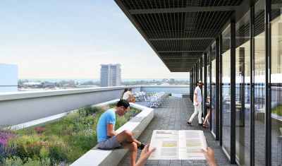 Последния 6 етаж създателите на проекта са нарекли "Павилиона" - пространство за четене с кафене и достъп до зелената покривна тераса. Тази зона ще разполага с подходящи места за посещение през целия ден, с автономен достъп, така че да бъде посещавана и след редовното работно време на Регионалната библиотека.