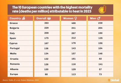 Резултатите показват общо 47 690 смъртни случая през 2023 г. в 35-те страни като цяло, от които 47 312 смъртни случая биха настъпили в най-горещия период на годината (между 29 май и 1 октомври). При отчитане на населението страните с най-високи нива на смъртност, свързана с горещината, са в Южна Европа , а именно Гърция (393 смъртни случая на милион), България (229 смъртни случая на милион), Италия (209 смъртни случая на милион), Испания (175 смъртни случая на милион). милиона), Кипър (167 смъртни случая на милион) и Португалия (136 смъртни случая на милион).
