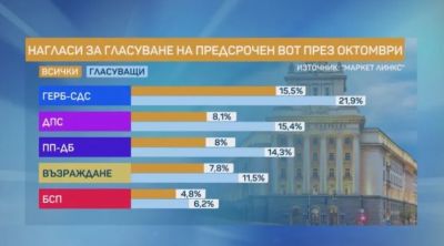 ГЕРБ ще са първа сила с 21,9%, ако предсрочните парламентарни изборите бяха днес. Това сочат данните от национално проучване, финансирано и реализирано съвместно от bTV и "Маркет ЛИНКС".