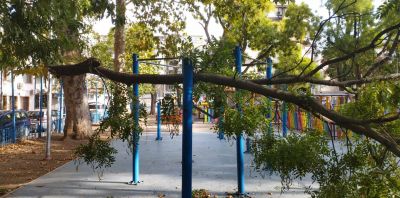 За сериозността на инцидента говори и това, че падналият клон е успял да да изкриви металната конструкция на уредите за уличен фитнес.
