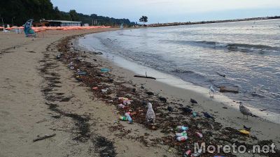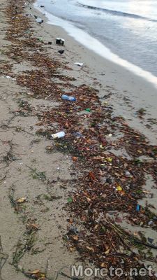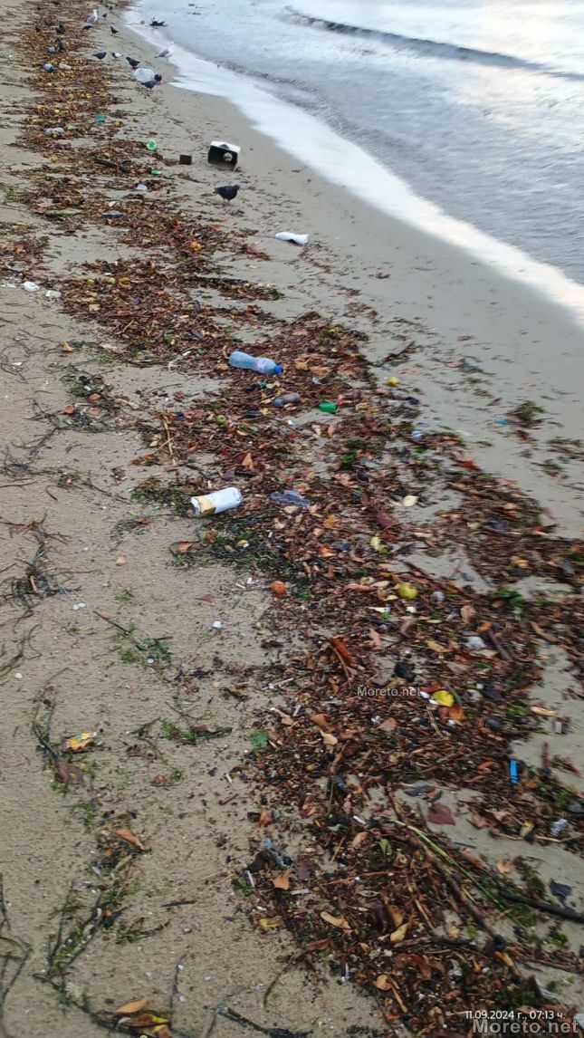 Множество кенчета и бутилки, както и друг тип отпадъци, е изхвърлило бурното море на Офицерски плаж, видя репортер на Moreto.net.