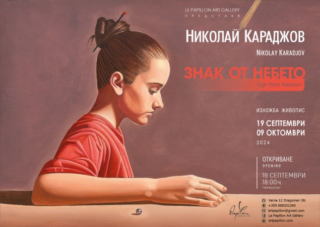 С удоволствие от 19-ти септември до 9-ти октомври 2024 г. Арт Галерия Le Papillon представя за пръв път в пространството си със самостоятелна изложба нежния модерен реализъм със сюрреалистични елементи на Николай Караджов. Като „Знак от небето“ е не само едноименната творба, обединител на експозицията, но често и закодираните послания на енигматичността в сюжета на маслените му платна.
