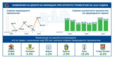 През второто тримесечие на 2024 г. цените на жилищата в страната са се увеличили с 15.1% в сравнение с второто тримесечие на 2023 година.