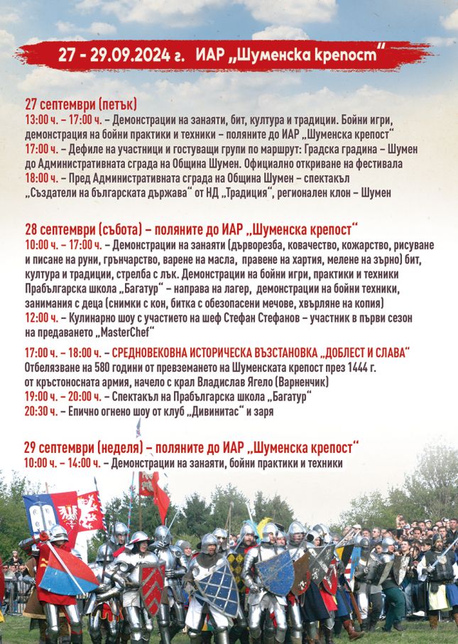 27 септември (петък) – 13:00 часа – поляните край ИАР „Шуменска крeпост“ – демонстрации на занаяти, бойни игри и техники, представяне на средновековните бит и култура.