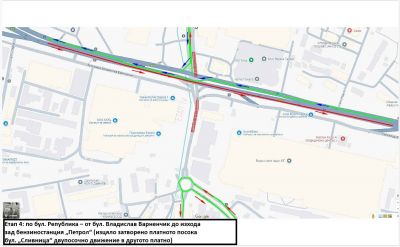 4. Етап 4: по бул. Република – от бул. Владислав Варненчик до изход зад бензиностанция Петрол (изцяло затворено платното посока бул. „Сливница“ двупосочно движение в другото платно) – срок от 8.12.2024 до 8.02.2025 г.