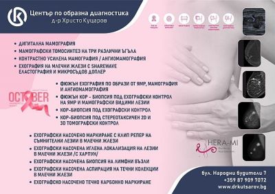 С желание да съдейства максимално на жените в тази важна мисия, Център по Образна диагностика Д-р Христо Куцаров предлага специални промоции през месец Октомври тази година: