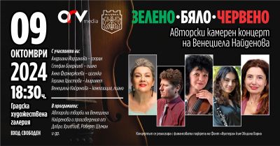 „Зелено-бяло-червено“ е авторски концерт/портрет на Венециела Найденова. Публиката ще има възможност да се наслади на някои от авторските произведения на Венециела Найденова, както и познати творби от Добри Христов, Роберт Шуман и Федерико Гарсиа Лорка. Участие ще вземат сопраното Андриана Йорданова, която пристига в България специално за събитието, концертмайстора на Варненска опера Анна Фурнаджиева, кларинетистката Гергана Христова, както и пианиста и диригент Стефан Бояджиев.