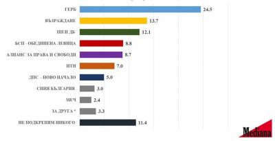 Ако изборите бяха днес, то ГЕРБ-СДС щяха да получат 24.5% от гласовете на избирателите, "Възраждане" са втори с 13.7%, ПП-ДБ биха получили 12.1%, БСП - Обединена Левица - 8.8%, АПС на Доган - 8.7%, ИТН - 7.0%, ДПС - Ново начало на Пеевски - 5.0%, сочи последното социологическо изследване, две седмици преди вота, изпълнено от агенция "Медиана".