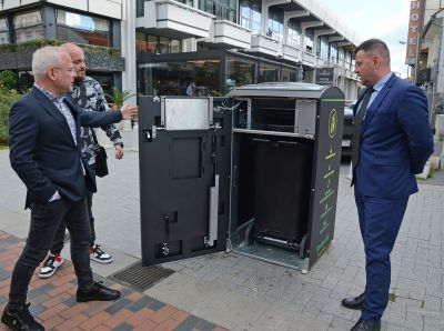 Как работи първият в града смарт контейнер за компактиране на отпадъци демонстрира зам.-кметът по екология Христо Рафаилов демонстрира.
