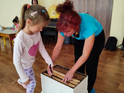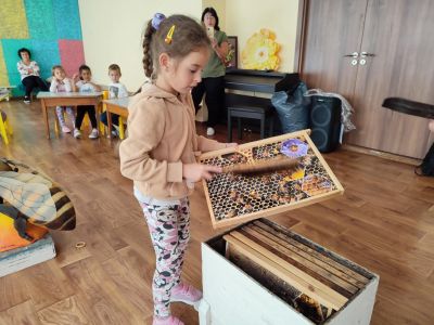 Заедно с нея е с нея е специалистът по екологично образование от Обществен център за околна среда и устойчиво развитие Елен Сабатини, която вече 18 години се занимава с пчеларство в България. От името на пчеличката, тя показва на децата какво има в един кошер, какви инструменти и оборудване използва пчеларя, какво представлява тревната, как ухаят и изглеждат различните пчелни продукти… Децата могат да облекат дрехите на пчеларя и да извадят една по една питите от истински кошер, в който има безброй въпроси за безценните насекоми. Така пипайки, миришейки, слушайки, гледайки, дърпайки жилото на Елен, те постепенно се научават да не се страхуват, а да обичат и ценят пчелите. Защото разбират колко много се трудят, за да има какво да сложим на трапезата си.