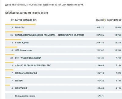 Резултати при 82.42% обработени протоколи от ЦИК за изборите за НС