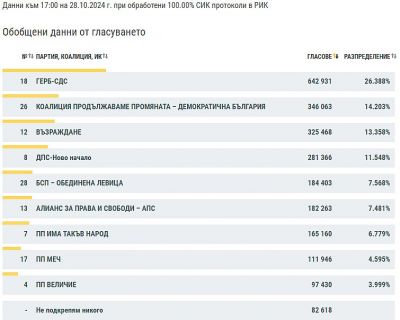 Ясни са кои партии и коалиции влизат в 51-ото Народно събрание - осем на брой, според данни от преброяването на вота при 100% обработени протоколи в РИК.