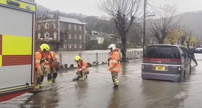 Драматични кадри, които се появиха през уикенда, показаха реки в Уелс, един от най-тежко засегнатите райони, които излизат от коритото си, потапяйки улици и автомобили.