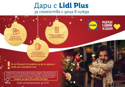 От 2 до 15 декември Lidl стартира национална дарителска коледна кампания в подкрепа на семействата с деца в нужда. В рамките на този период всички потребители на Lidl Plus ще имат възможност да даряват хранителни продукти през приложението. В допълнение Lidl ще предостави и тяхната парична равностойност на организацията партньор в кампанията - „Надежда и домове за децата“. Кампанията стартира знаково в седмицата на Щедрият вторник - световния ден на дарителството, и движение, което вдъхновява хората по целия свят да променят обществата със силата на щедростта и участието си.