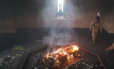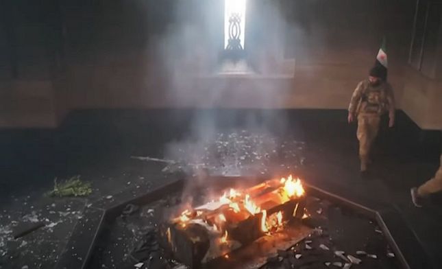 Видеозаписи показват въоръжени мъже, които пеят, докато обикалят горящия мавзолей в Кардаха, в северозападната част на крайбрежния регион Латакия, съобщава BBC.