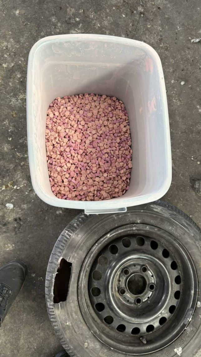 В резервната гума митническите служители открили в насипно състояние 18 410 грама розови таблетки, които при тестване с полеви наркотест реагирали на метамфетамин.