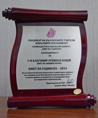 Кметът на Варна Благомир Коцев е удостоен с наградата „Кмет на годината – 2024“ от Синдиката на българските учители. Отличието се присъжда за постигнати високи резултати в съвместната дейност през годината и личния му принос в развитието и усъвършенстването на социалното партньорство между Община Варна и СБУ. Наградата е в рамките на националния конкурс „Най-добър социален партньор – кмет“, който се провежда за 18-ти път.