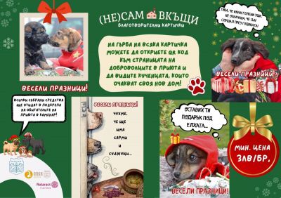 На гърба на всяка картичка е поставен QR код към страницата на доброволците, където се виждат кученцата, които очакват своя нов дом. Всички събрани средства от каузата, ще отидат за грижа за четириногите. Минималната цена за една картичка е 3 лв., заедно с плик и е напълно подходяща да зарадвате свой близък или приятел на предстоящите празници.