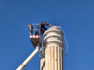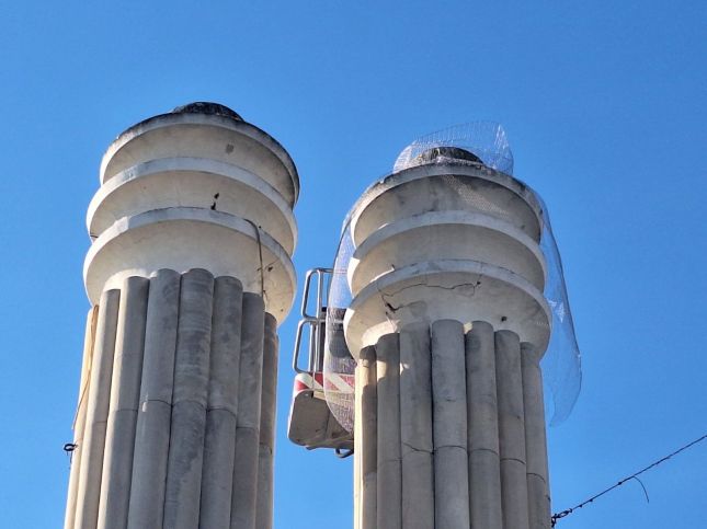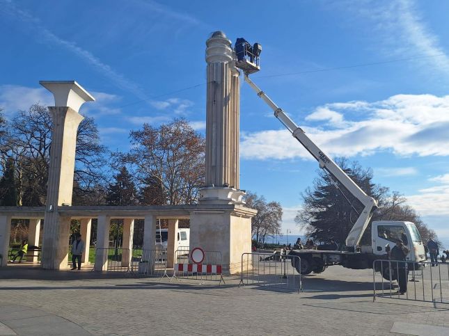 Община Варна предприе допълнителни действия по обезопасяване на колонадата на входа на Морската градина. Две от осемте колони на арката вече са покрити с мрежа от поцинкован метал и затегнати с метални неръждаеми обръчи, за да се избегне оцветяване на камъка.