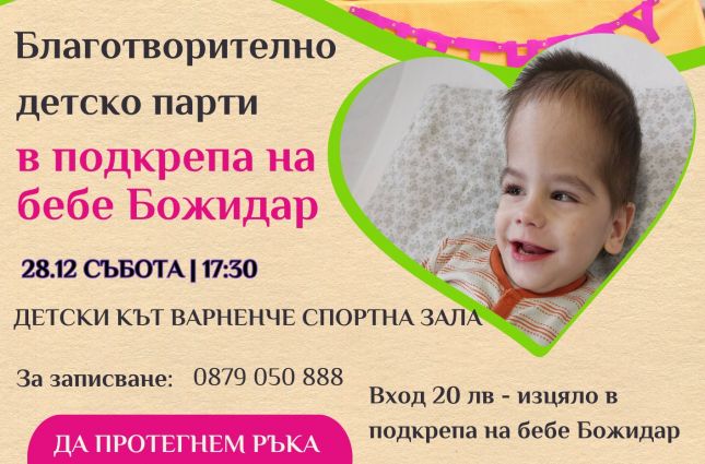 Детски кът „Варненче“ – Спортна зала, кани всички деца и родители на специално благотворително парти, което ще се състои на 28 декември събота от 17:30 часа. Събитието е в подкрепа на малкия герой бебе Божидар, който ежедневно води тежка битка за своето здраве.