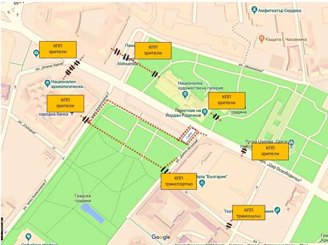 Пътното движение по бул. „Цар Освободител“ в участъка между ул. „Раковски“ и пл. „Независимост“, както и по прилежащите улици на бул. „Цар Освободител“ в ограничения участък, ще бъде преустановено в 18.30 часа. Ще бъде обособена пропускателна зона, като допускането на зрители ще започне в 20 часа и ще бъде осъществявано през шест контролни пункта.