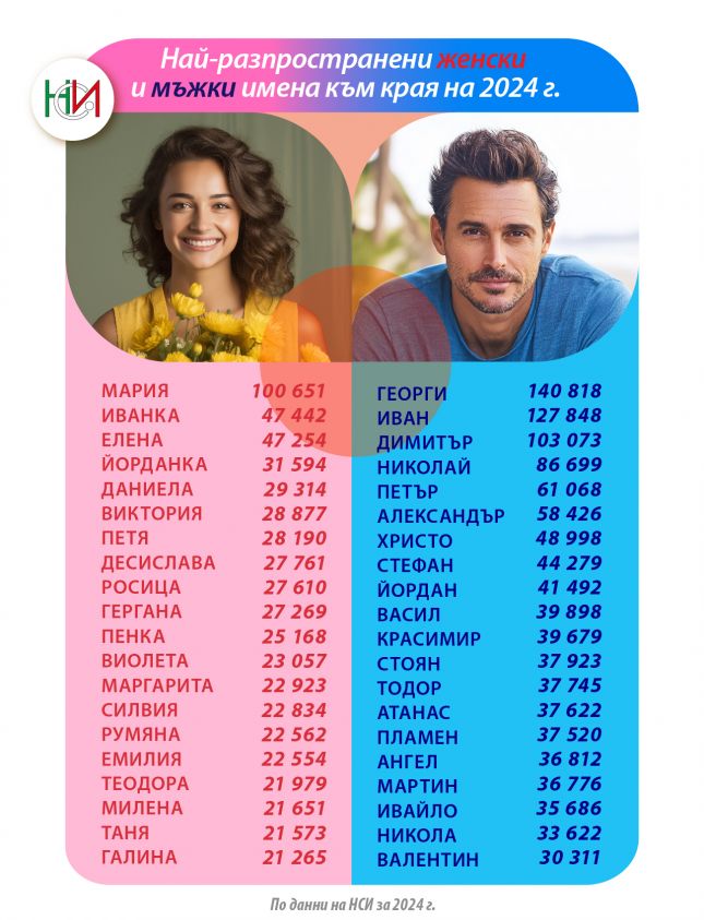 Иванка е второто най-срещано женско име у нас след Мария, а Йорданка е на четвърто място, сочат данните на НСИ.