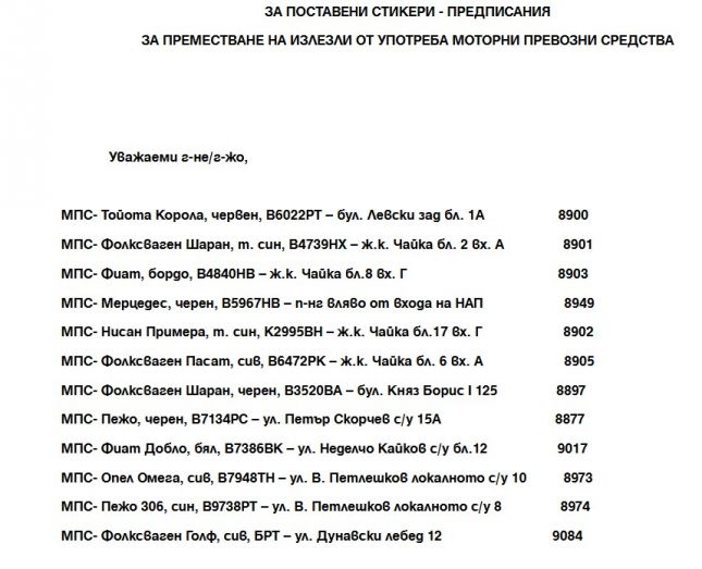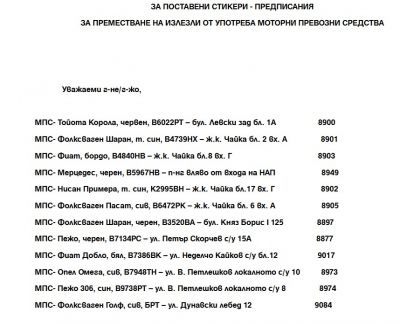 С предупреждение за преместване са 10 коли с варненска регистрация, една с кърджалийска и една без регистрационни номера. Колите се намират основно в кварталите „Чайка“ и „Левски“.