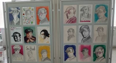 Във фоайето са представени рисунки, илюстрации, съчинения, стихотворения и други материали изготвени от учениците и свързани с личността и творчеството на Гео Милев, както и много негови портрети на които той е изобразен с емблематичния кичур коса над едното око. Подредена е фотоизложба с бивши възпитаници на училището, които сега са учители в него. Сред тях е и директорът д-р Мартин Вълчев. Показани са снимки от личните архиви на учителите от времето на техните ученически години. Използвани са снимки и от училищния фотоархив, които показват първите професионални стъпки на преподавателите.
