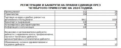 В сравнение със същото тримесечие на 2023 г. общият брой на новорегистрираните се увеличава с близо 5%, а този на банкрутиралите - с малко над 19 на сто.