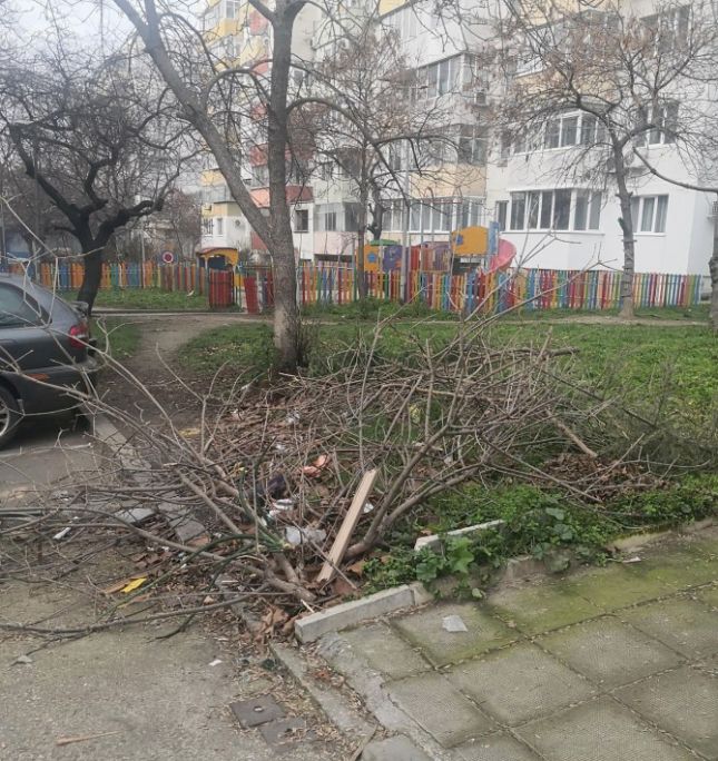 По информация на граждани детската площадка в района и пространствата около нея са силно замърсени, в зелените площи има гниещи сухи клони от подрязаните наблизо дървета, а около съдовете за смет - нахвърлян боклук. Веднага след постъпване на сигнала на място е изпратен екип, който е почистил терените, а отрязаните клони са отстранени и извозени.