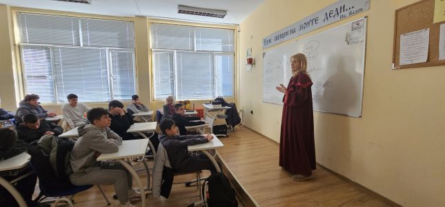 След като се запознаха с основната тема, засягаща работата на прокурорите, техните отговорности в обществото, техните основни задължения и функции, осмокласниците активно се включиха в разговор с прокурор Якимова. Тя провокира тяхното логическо мислене с въпроси от практиката й на прокурор, накара ги да гледат на една ситуация от различни гледни точки и да се поставят в позицията на различните участници в нея. Така учениците успяха да разберат по-добре сложността на всеки отделен казус и да осъзнаят, че всяка различна перспектива дава допълнителни детайли за едно и също действие.