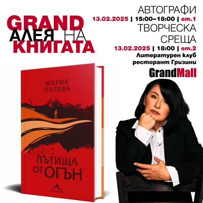 Мария Лалева ще раздава автографи на 13.02. от 15:00 до 18:00 на ниво 1. Творческата среща с нея - премиера на най-новата й книга “Пътища от огън” започва в 18:00 в Литературен клуб ресторант Гризини на ниво 2.