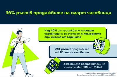 Интересът към носимите устройства, смятани за бъдещето в света на умните технологии, отбелязва значителен ръст спрямо данните от 2023 г. – цели 36%. Един от основните двигатели на това увеличение е нарастващата популярност на LTE моделите с поддръжка на функцията multiSIM, чиито продажби са се увеличили с 29% през миналата година. Значителният ръст на потребителите, които използват услугата multiSIM в мрежата на Yettel – приблизително 34% повече спрямо 2023 г., затвърждава и тенденцията за търсене на все по-голяма автономност на смарт часовниците от смартфоните. Yettel е и единственият телеком в България, който предлага услугата MultiSIM за Apple Watch.