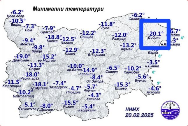 Това е и рекорд за най-студен 20 февруари в Добрич. Досегашният рекорд за минимална стойност на тази дата е от 1984 година, когато са били отчетени -18.4 градуса.
