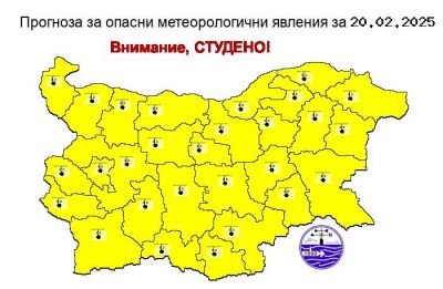 За всички области у нас днес има обявен жълт код за опасно ниски температури. С изключение на някои крайморски общини като Варна, навсякъде максималните температури ще са отрицателни.