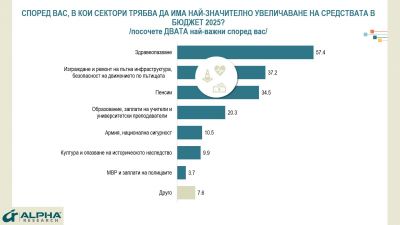 Според 57% от българите, най-значително увеличение на средствата в Бюджет 2025 трябва да има за здравеопазване. Здравеопазването е приоритет за абсолютно всички социални, демографски и електорални групи, като единствено при хората над 65 години е изместено от желанието за ръст на пенсиите. Това показват резултатите от национално представително проучване на агенция Алфа Рисърч, реализирано със собствени средства. Анкетата е проведена в периода 20-28 февруари сред 1000 пълнолетни граждани от цялата страна, интервюирани по домовете им с таблети.