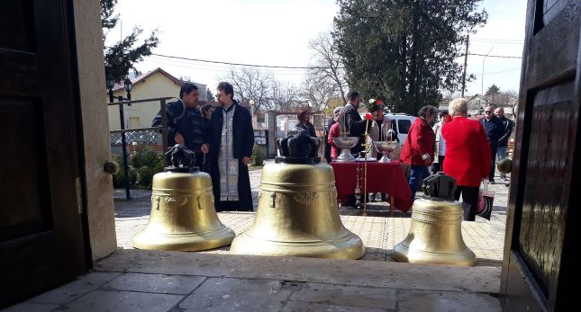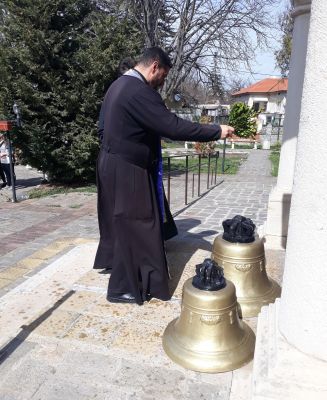 Вчера новите камбани пристигнаха в града. Отец Алексей отслужи празничен водосвет, благослови ги и ги поръси със светена вода.