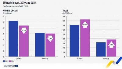 През 2024 г. Европейският съюз е изнесъл 5,4 милиона автомобила и е внесъл 4,0 милиона автомобила. Въпреки че броят на изнесените автомобили намалява с 13,2% спрямо 2019 г., а този на внесените - с 3,0%, общата стойност на търговията бележи ръст, показват данни на Eurostat.