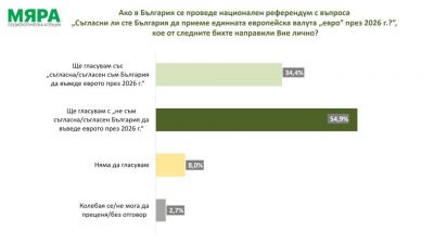 Ако в България се проведе национален референдум с въпроса „Съгласни ли сте България да приеме единната европейска валута „евро“ през 2026 г.?“, кое от следните бихте направили Вие лично? 34,4% казват, че ще гласуват със съгласна/съгласен, а 54,9% – че ще гласуват с несъгласна/несъгласен. Останалите няма да гласуват или се колебаят, показва проучването.