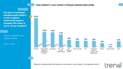 В електоралната картина също не се наблюдават съществени промени. ГЕРБ запазва първата си позиция с 26.2% от гласуващите. С изключително близки стойности са ПП-ДБ (13.8%) и Възраждане (13.5%). Лек ръст се регистрира при ДПС-Ново начало до 11.6% сред гласуващите. БСП-ОЛ задържа нивата си от 6.8%. Три партии разполагат със сходна подкрепа – ИТН с 6%, МЕЧ – 5.9%, а при ДПС (Доган) се регистрира ерозия до 5.8% от гласуващите спрямо 6.7% през март. Величие остават близо до ръба на парламентарната бариера с 3.9% подкрепа сред гласуващите.