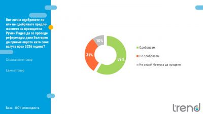 59% от интервюираните одобряват инициативата на президента Радев за провеждане на референдум относно приемането на еврото в България през 2026 г. 31% не подкрепят подобно допитване.