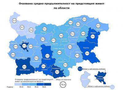 Вариации се наблюдават и на регионално ниво, като най-ниска продължителност на живота е отчетена в област Видин (71.9 години), а най-висока – в София (столица) със 77.3 години. Сред първенците са и Кърджали - 76.7 г. и Благоевград - 76.6 години.