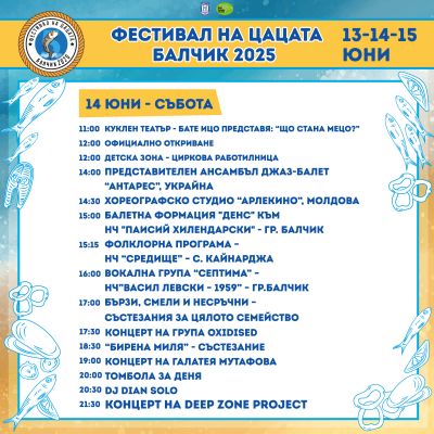 Програмата за фестивала днес, 14 юни, е изключително богата и разнообразна. Фестивалният ден ще започне с куклен театър, като включва циркова работилница, фолклорни програми и семейни състезания, които са традиционен акцент за Фестивала на Цацата – състезанието „Бирена миля“, „Бързи смели и несръчни“.