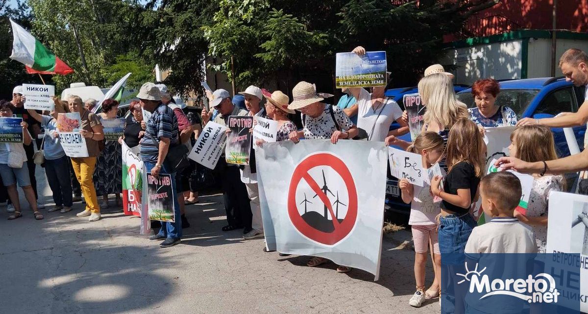 Гражданите се събраха пред сградата на РИОСВ, докато вътре течеше заседанието на съвета, държейки плакати с надписи „Никой не е по-голям от хляба-не режи клона, на който седиш“, „Ветрогенераторите не се рециклират“, „Не на урбанизирането на плодородната земеделска земя“.