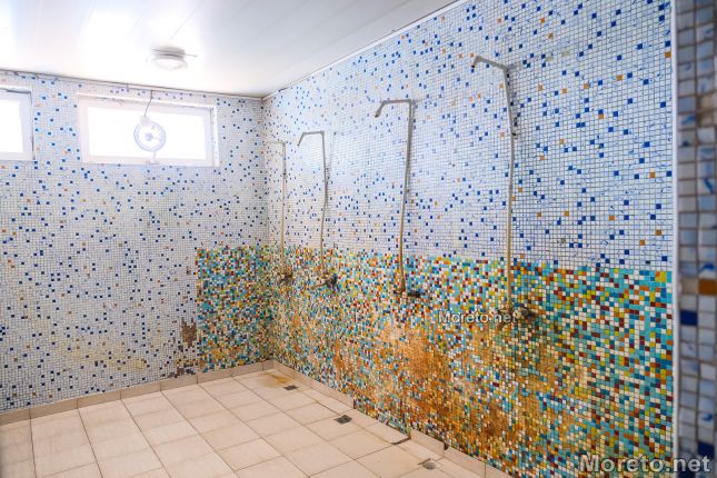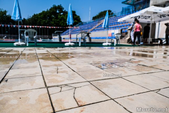 Съвсем видно е, че голяма част от плочките в басейна липсват. Никак не е добро състоянието и на настилката около съоръжението. В съблекалните и душовете също има какво да се желае. Начупени или липсващи плочки, корозирали метални елементи.